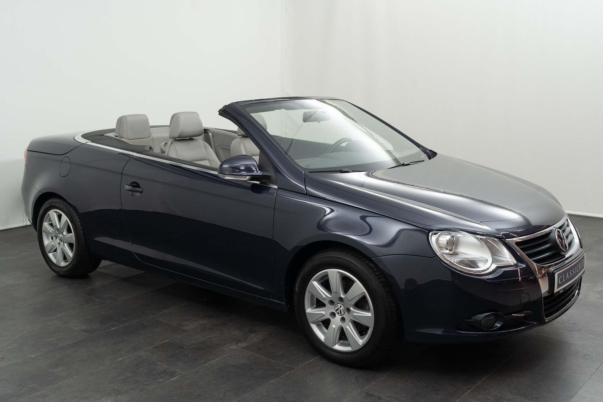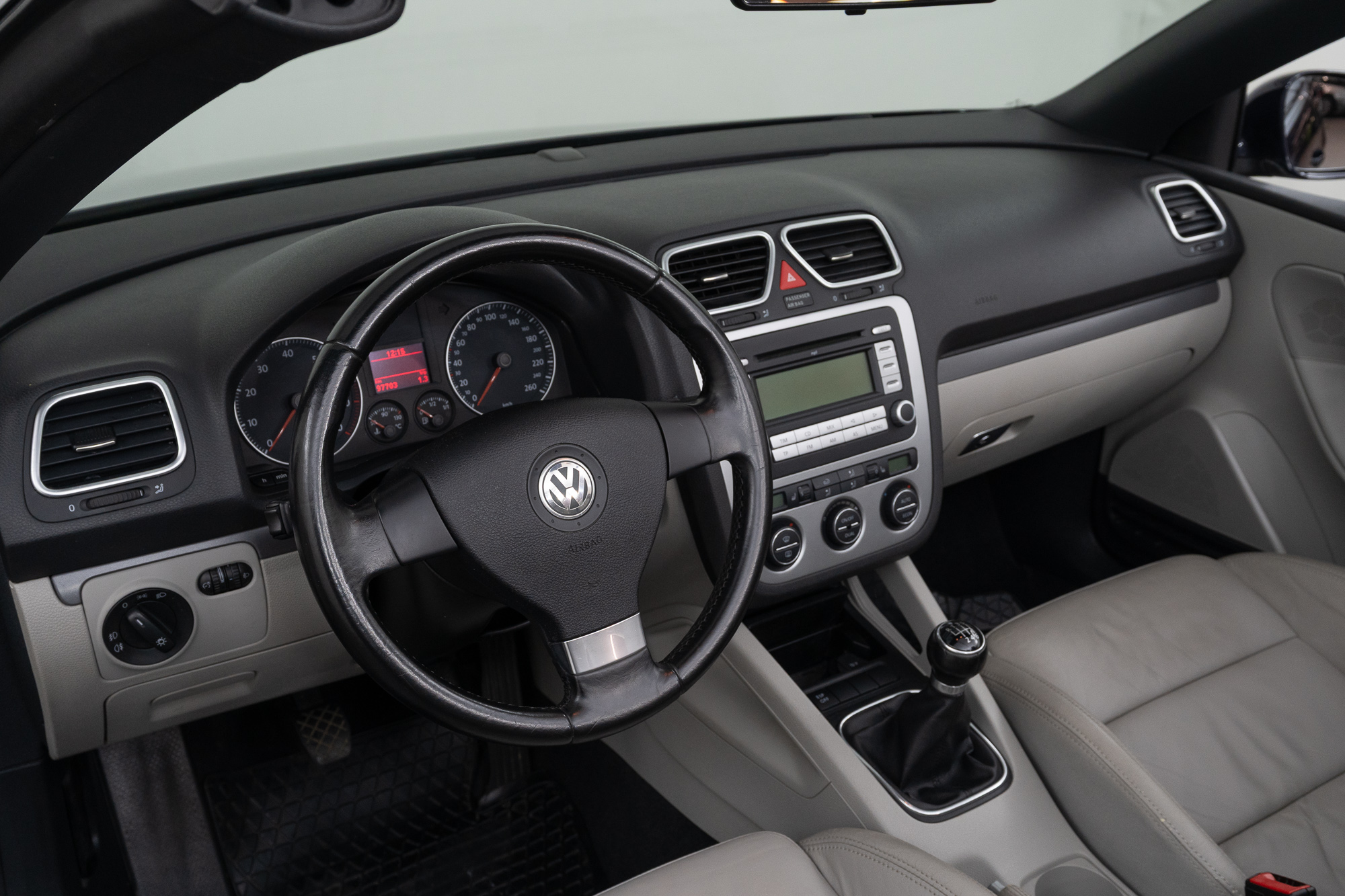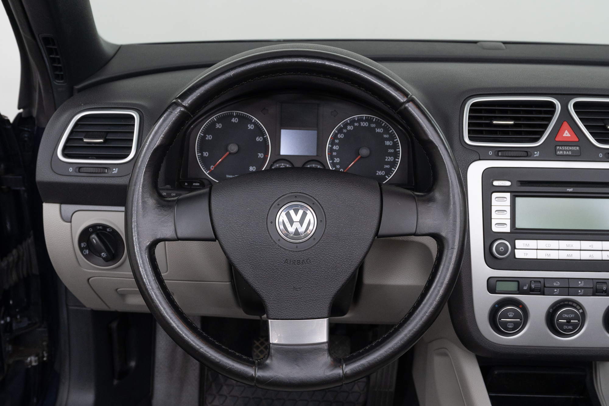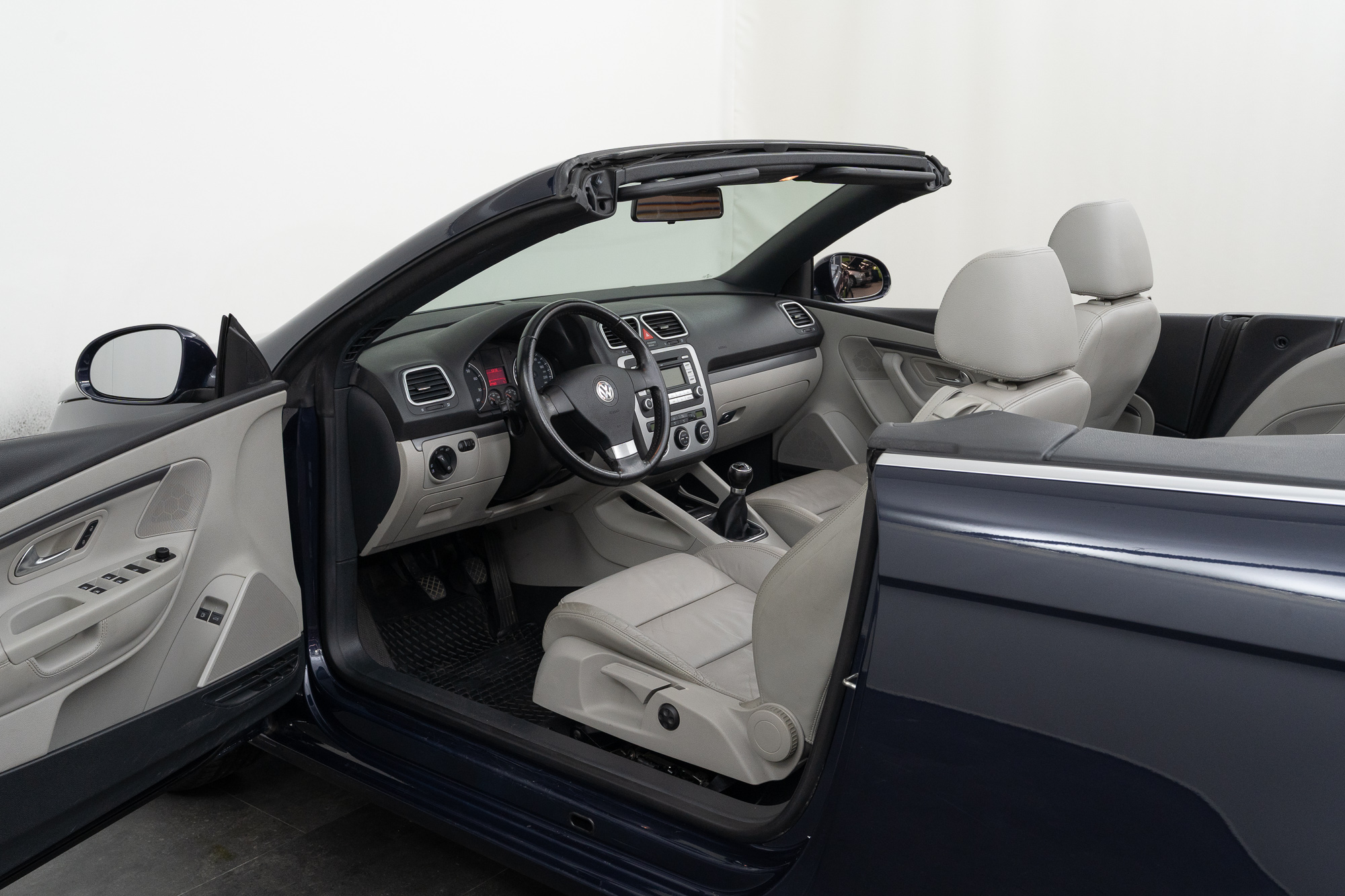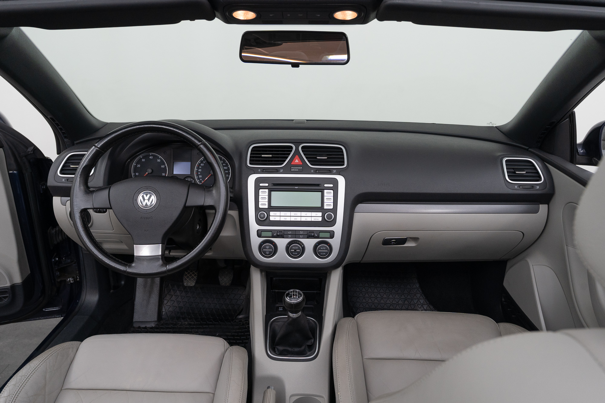 The Eos is a comfortable coupé-convertible with an electric soft top that offers driving pleasure whether open or closed. The interior is high-quality with gray leather upholstery, a leather steering wheel, and a leather center armrest. Seat heating, automatic climate control, cruise control, and electric windows and mirrors provide additional comfort.